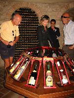 I det aller helligste hos Faustino var det et ”gravkammer” hvor kjente personer hadde sitt eget private lager som hvert rommet 300 flasker. Her var det berømtheter innen tyrefekting, golf og opera, for ikke å glemme det spanske kongehus som hadde sitt lager. Det var ikke umulig for vår vinklubb å reservere tilsvarende antall flasker i ”gravkammeret” også. I denne kjelleren var det en flott utstilling av viner fra forskjellige årganger. Gjesteboken var full av hilsninger fra nær og fjern og våre takksigelser ble skrevet av Trond med våre verdifulle navnetrekk. Våre kjære verter hadde det noe travelt og vi avsluttet besøket med gaveoverrekkelse og gruppebilde.